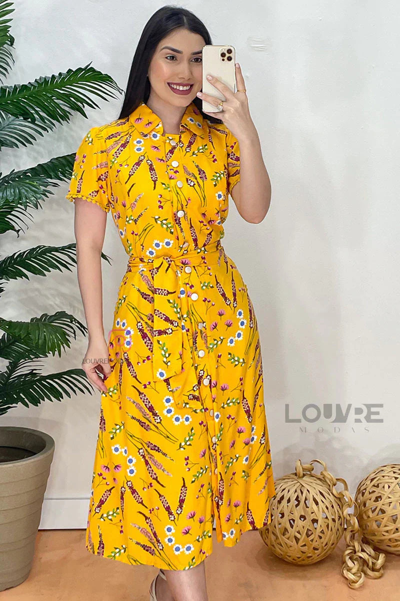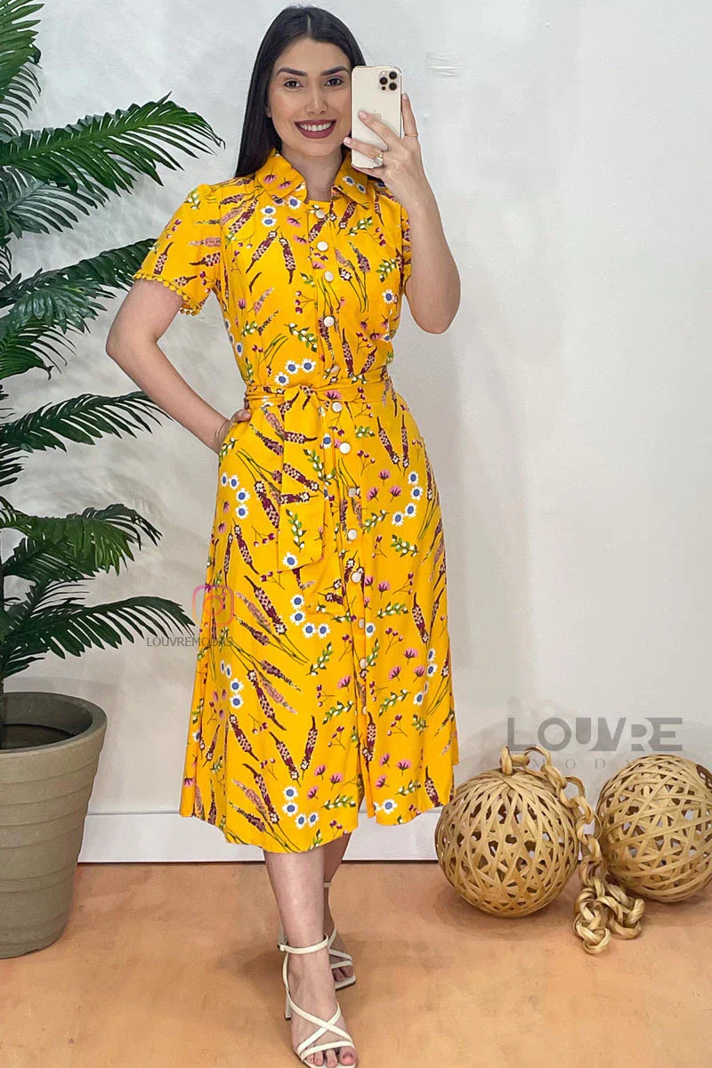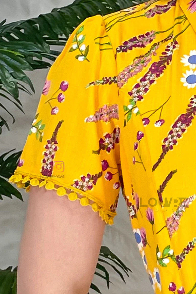 Vestido estampado amarillo con botones funcionales, bolsillos y detalles de encaje guipur.