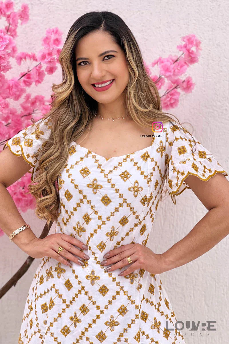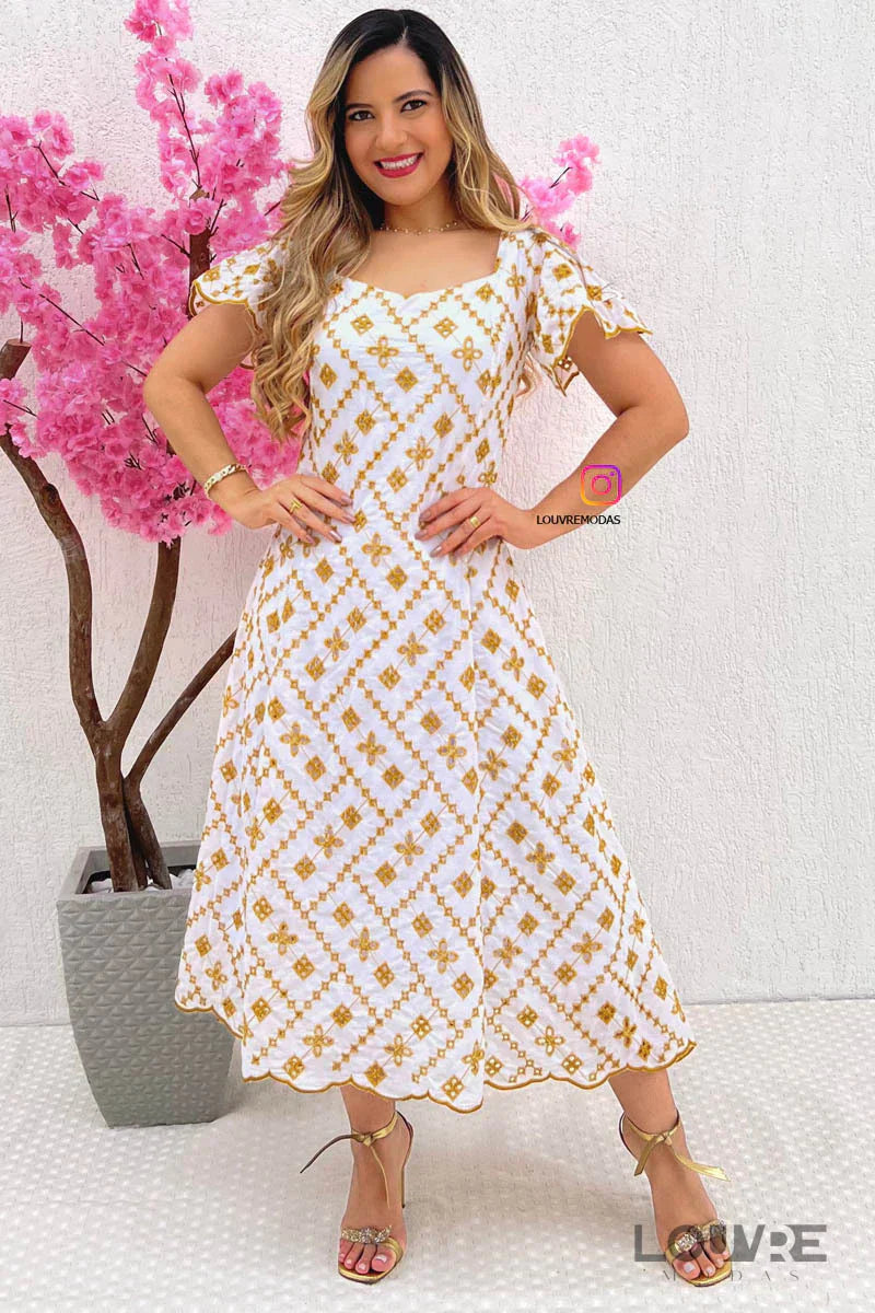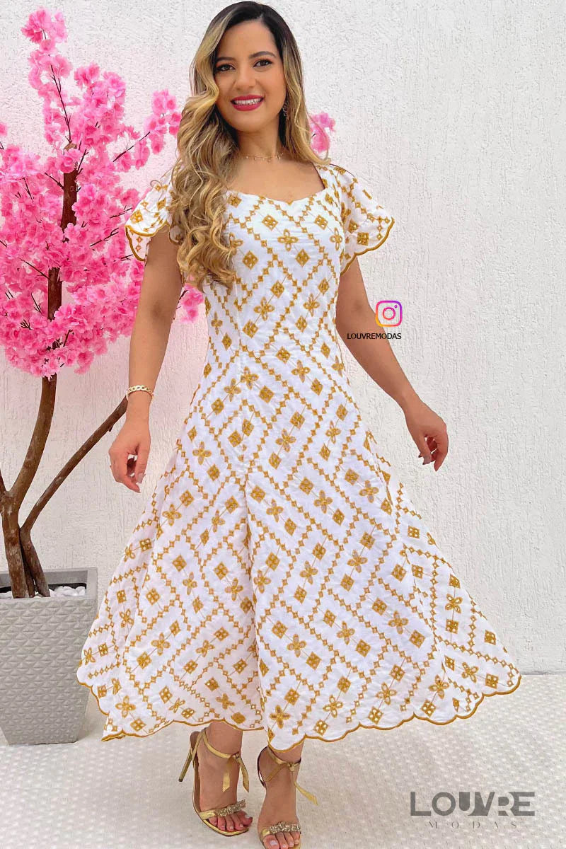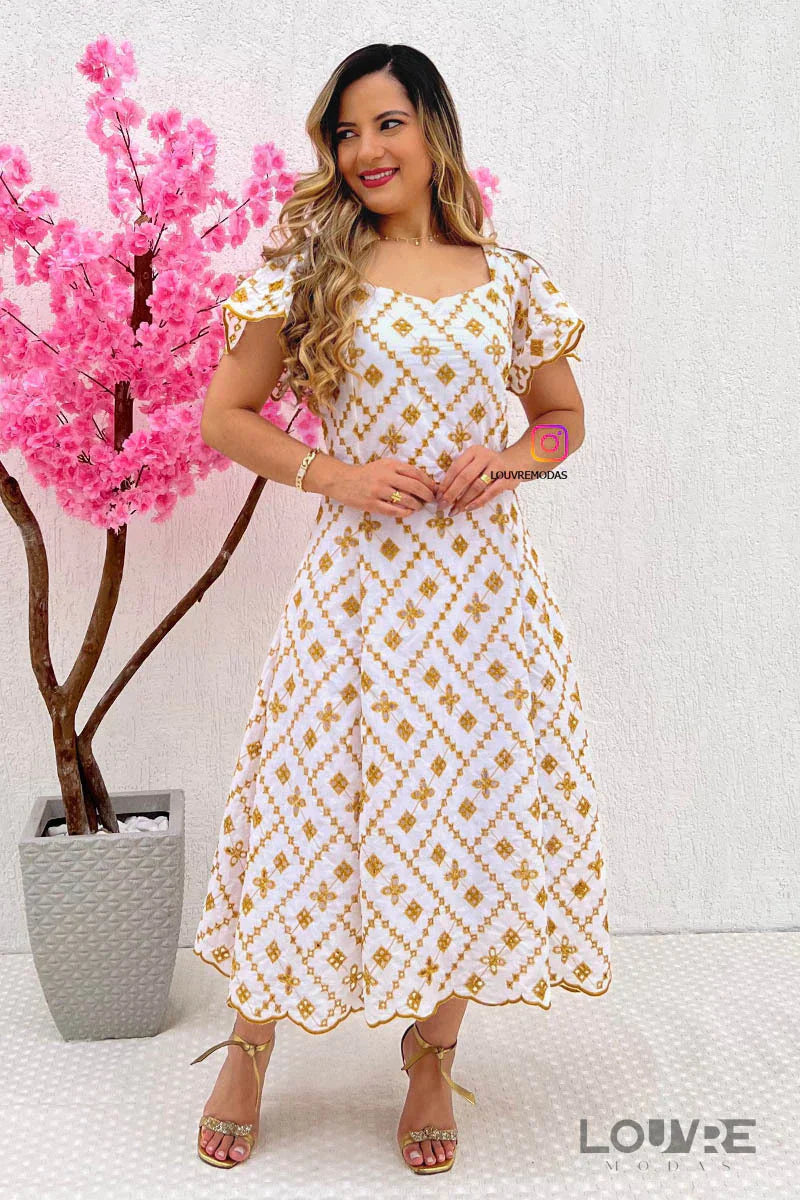 Vestido blanco con bordado dorado.
