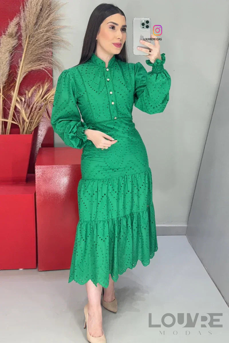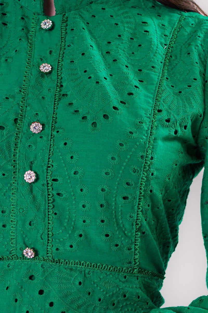 Vestido en encaje 100% algodón, bordado y forrado, con detalles de encaje guipur.