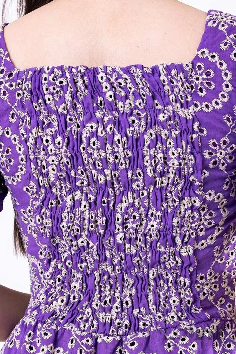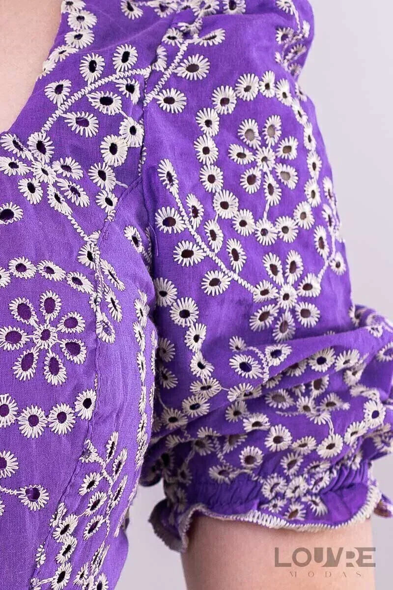 Vestido de encaje morado con elegante bordado.