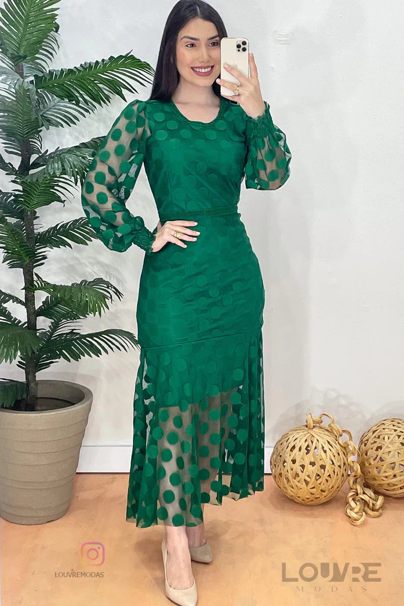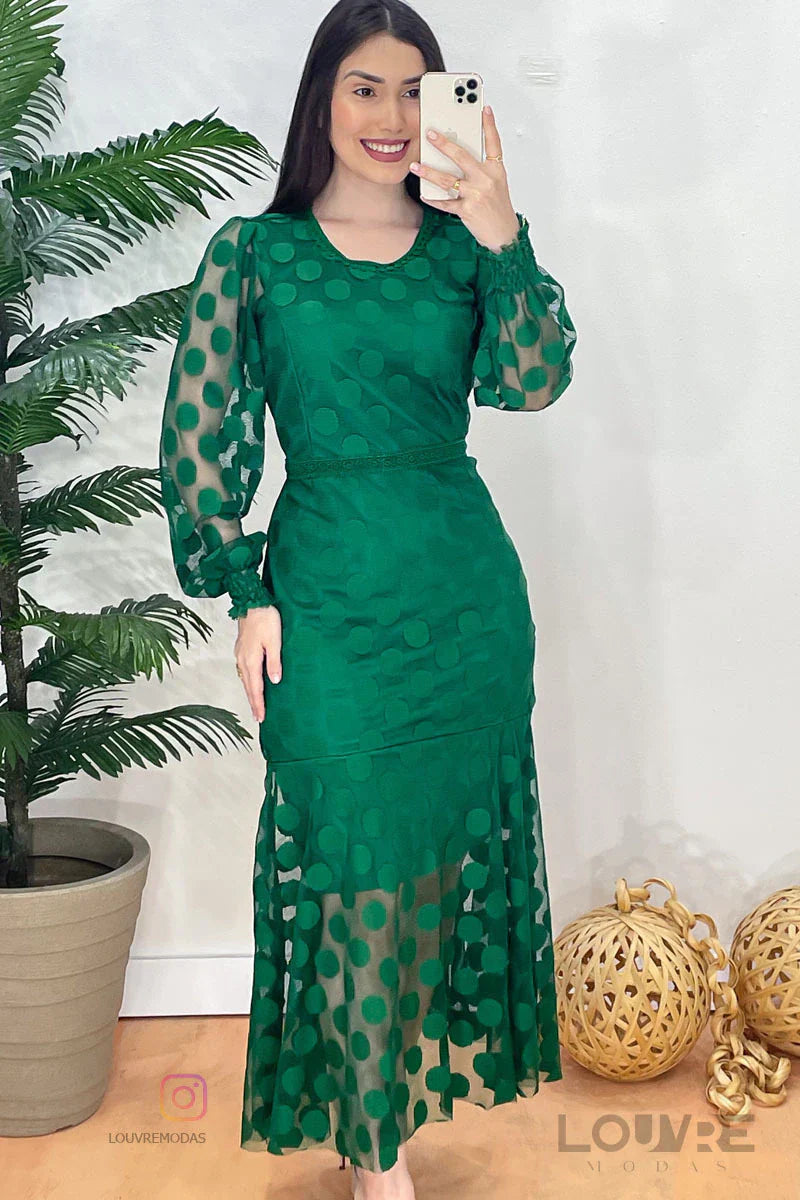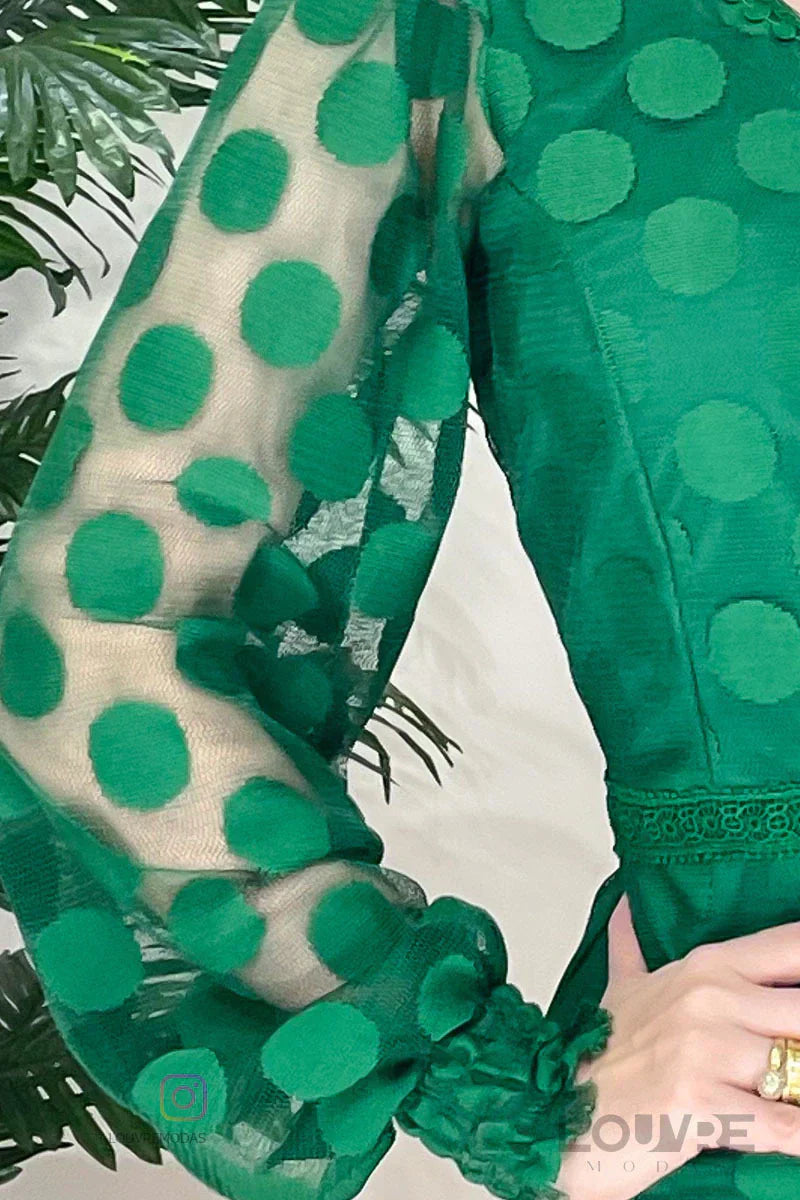Vestido de tul verde forrado con elegantes detalles de encaje guipur.