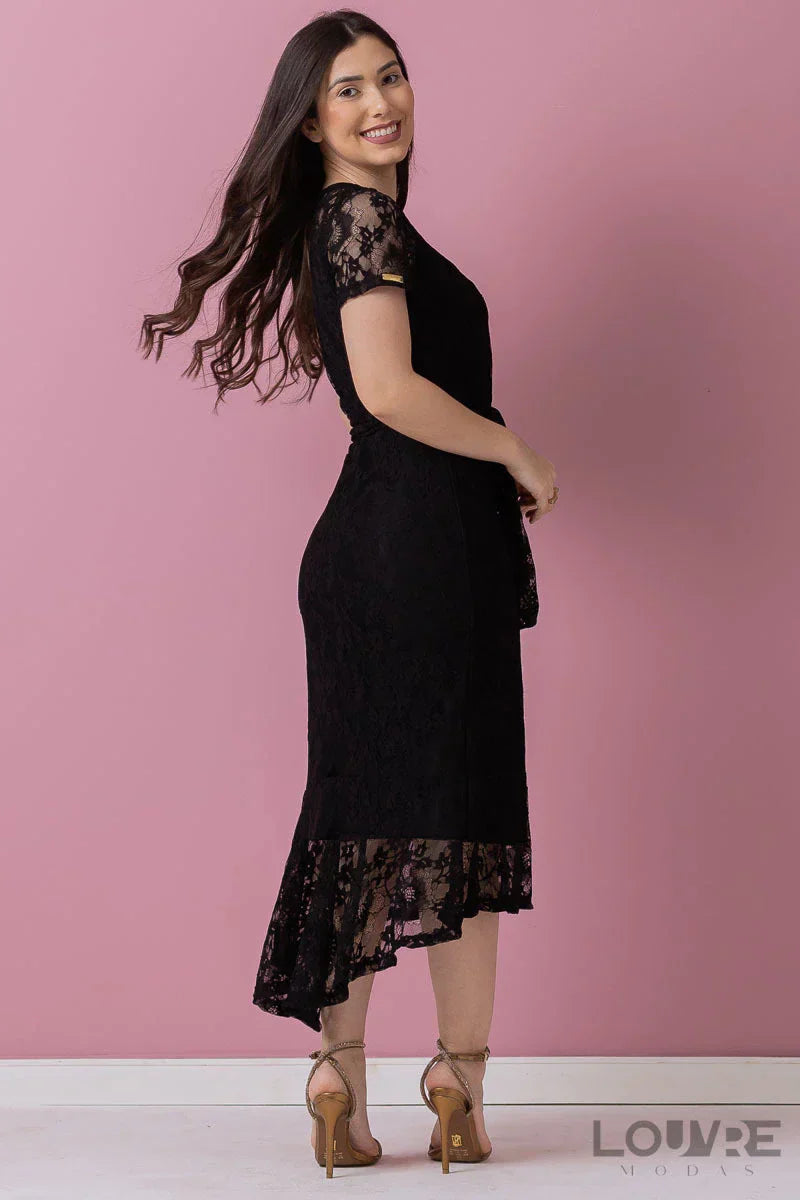 Vestido Mullet Negro en Encaje Noronha, forrado y con cremallera invisible.