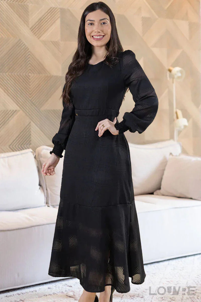 Vestido de gasa negro con manga larga y cintura elástica.
